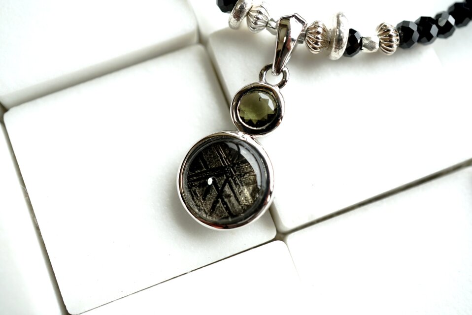 モルダバイトとメテオライトのコンビネーションをお楽しみいただけるペンダントトップを下げたネックレス。