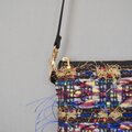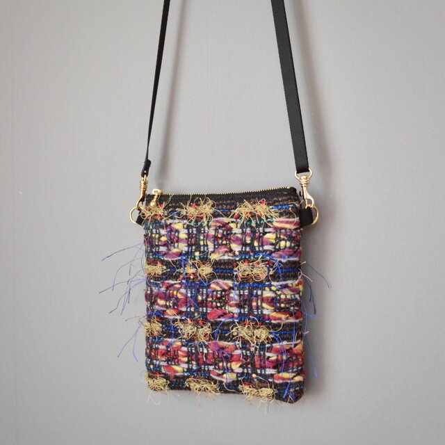 変わり糸を効果的使用したスマホショルダーです。個性的なテクスチャーがお洋服の楽しいワンポイントになりそうです。