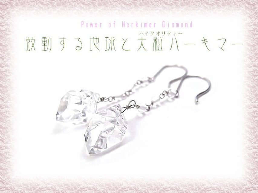 大変照りの強い希少な大粒ハーキマーダイヤモンドに可愛らしい小さな水晶玉が繋がるスウィングタイプ仕様になります。ボリューム感だけでなく、他とは一味違う大人のモノトーンエレガンスを醸し出すピアスになります。ハーキマーダイヤモンドクリスタルは研磨・カット加工された宝石とは違い「自然のままの美しさ」を楽しめる天然石です。天然のままでダイヤモンドにも優る輝きを持つだけでなく、天然水晶のもつ清らかな感触を感じていただけるでしょう。世界でたった一つの、自分のための美しいエナジーを感じ、そして楽しんでください。あなたの宝物です。