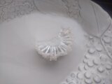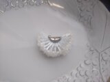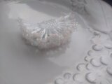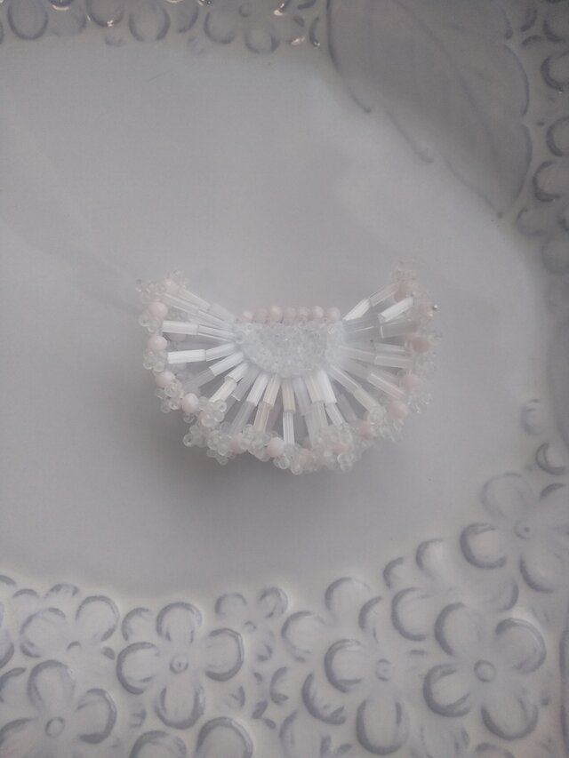 霜柱のイメージとのことでしたが、竹ビーズを使った花びらがとても新鮮で、仲良く手をつないでウェーブを作っているみたいで、とても可愛いブローチでした。 ホワイト一色に見えて、1段目と2段目の間から土台のビーズがキラッと光って見えてお洒落です。