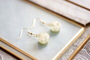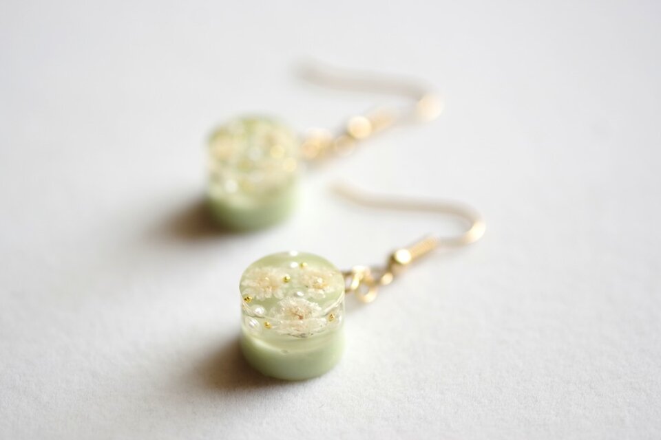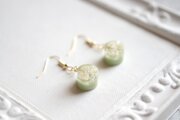 お花を三輪とパール、ブリオンを沈めたレジンと淡いグリーンで着色したレジンが二層になったピアス。
