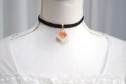 ホワイトシェルとコーラルに着色されたシェルのさざれを沈め、光沢のあるホワイトで囲ったレジンを、ベルベットリボンにタティングレースで装飾を施したチョーカーに仕上げました。