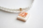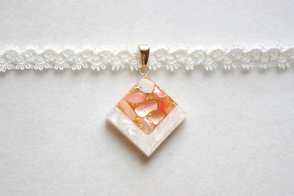 ホワイトシェルとコーラルに着色されたシェルのさざれを沈め、光沢のあるホワイトで囲ったレジンを、サテンリボンにタティングレースで装飾を施したチョーカーに仕上げました。