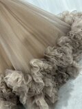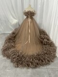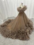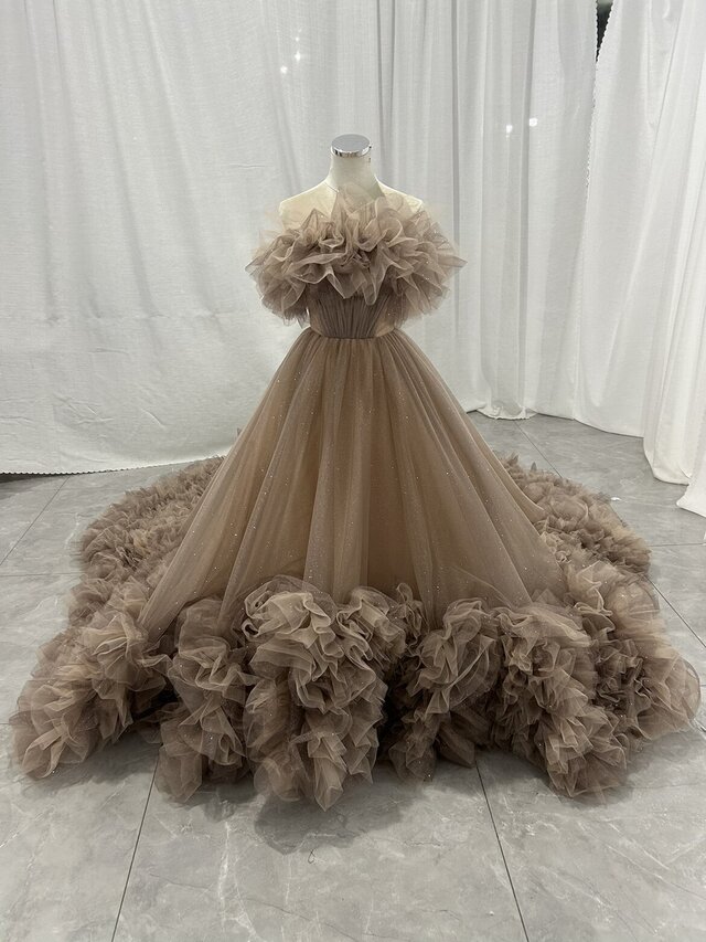 カラードレス カーキ色 オフショルダー ラッフルフリル 華やかなトレーン キラキラチュール クラシカル 花嫁