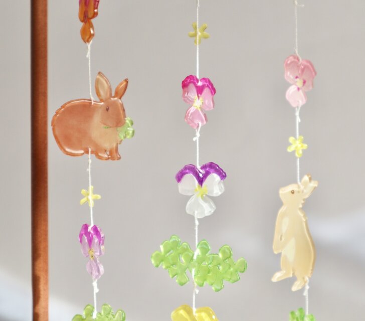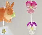 モビール もびーる ぷらばん ぷら板 プラ板 インテリア つやつや 部屋飾りガラス調 春2月3月4月5月 紫色 白 ピンク パステルカラー 女の子 ウサギ ビオラ パンジー オーナメント 結婚式 お祝い 癒し 自然 リラックス ニッチ 吊るし飾り イベント ガーランド ゆらゆら 桃色 黄色 緑 絵本 ギフト 赤ちゃん 立体 新築 手描き mobile interior ornament rabbit viola pink yellow purple green orange clover