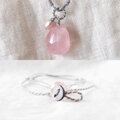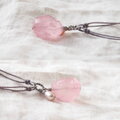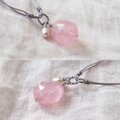 カットがキラリと輝き透明感のあるローズクォーツにピンクを帯びたシルバー系の照りが美しい淡水パールを添えてトップに配し、グレー色のポリエステルコードと合わせた上品な雰囲気のペンダントです。