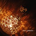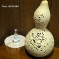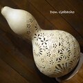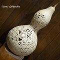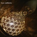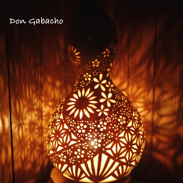 天然の大ひょうたんで製作いたしました。種から育てた大ひょうたんで、ひとつひとつ手作業で穴あけを行っています。和文様と花が咲き乱れる様から爛漫をイメージしております。ひょうたん本体のあかりだけでなく、壁や天井に映し出されるあかりも楽しんでください。