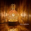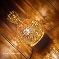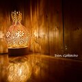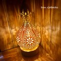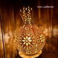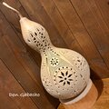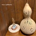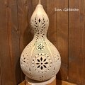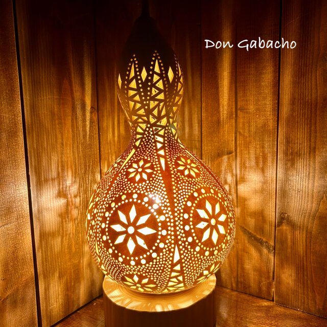 天然のひょうたんにモザイクを基調にイメージして製作いたしました。種から育てた大ひょうたんで、ひとつひとつ手作業で穴あけを行っています。ひょうたん本体のあかりだけでなく、壁や天井に映し出されるあかりも楽しんでください。