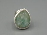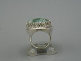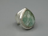 リングのサイズは13.5号、重さは37g、最大幅は32mm、手のひら側の幅は10mm、金属部分は純銀です。