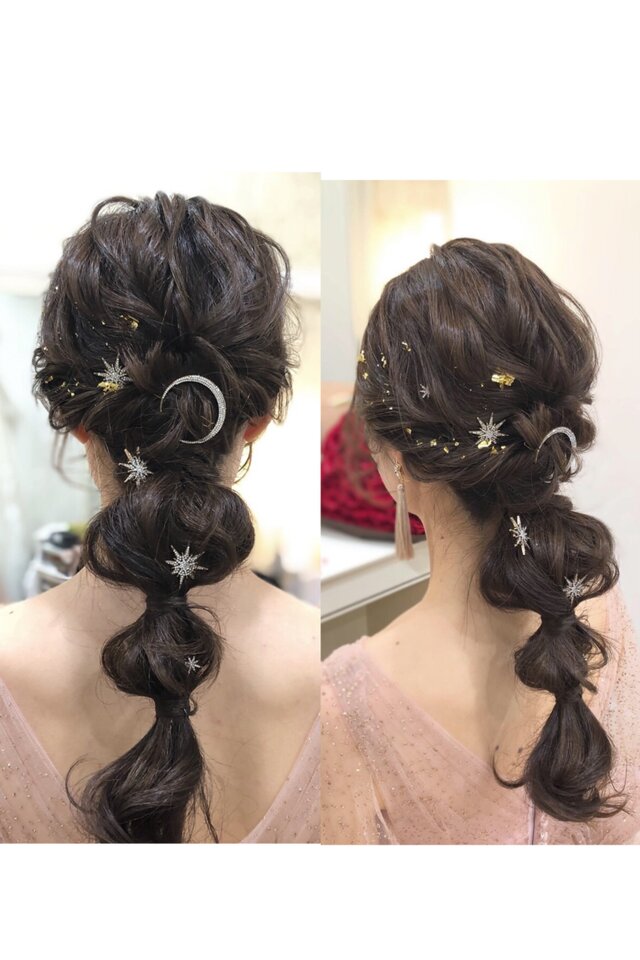 【結婚式 ヘアアクセサリー】星 月 ヘアピン 6本セット ゴールド/シルバー|小枝 ブライダル ウェディング 卒業式 成人式