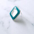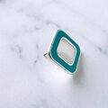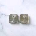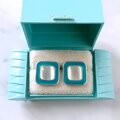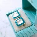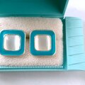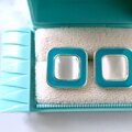 ブルーグリーンのエナメルで色付けされたスクエアの中央にムーングロウガラスがあしらわれたヴィンテージピアスです。