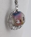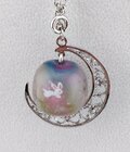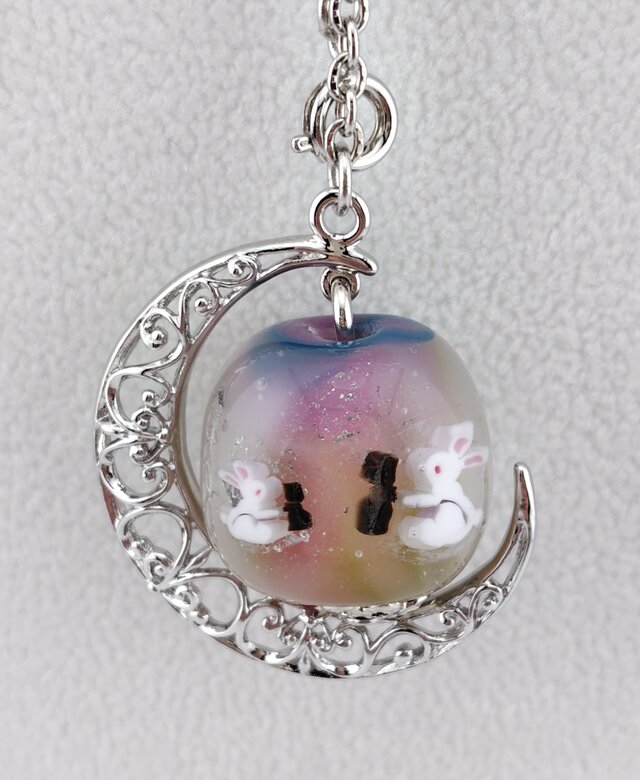 薄ピンクの地玉にうさぎのパーツを3つ埋め込み、金箔プラチナ箔でちょっと華やかにしました。銀の月にとんぼ玉がゆらゆらする、バックチャ-ムです。