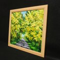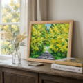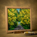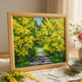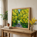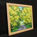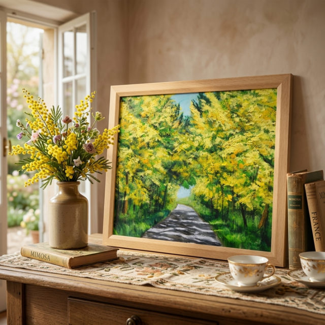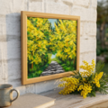 「光のトンネルを抜けて」は、幸福の象徴である黄色のミモザを主役に、圧倒的な多幸感を表現した美しい油絵作品です。この特別なアートは、光と影の美しいドラマを繰り広げ、見る人の心を明るく照らす存在として、お客様の空間に幸福をもたらします。