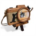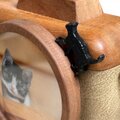 黒猫のオブジェが、静かな木製のカメラに生き生きとした躍動感をプラスします。猫がカメラを自分のおもちゃにしているような、微笑ましい光景を表現しました。