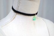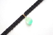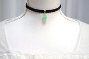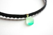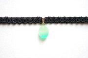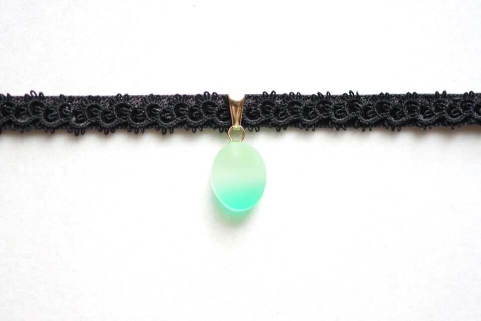 シーグラスやすりガラスのような柔らかな風合いと、そこからほのかに覗く爽やかな二色のグリーンが美しいレジンを、ベルベットリボンにタティングレースで装飾を施したチョーカーに仕上げました。