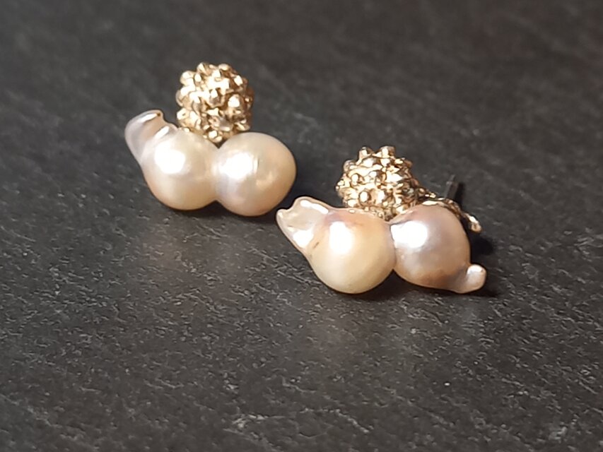 ツインパールは成長の過程で偶然に母貝の中で二つのパールが一つになったもので、とても稀少です。