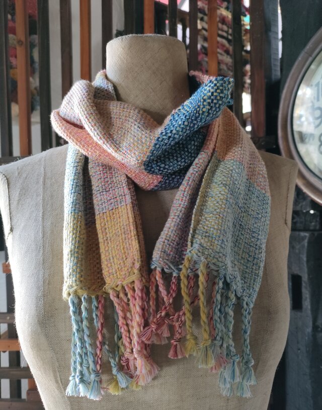 残糸利用 綿マフラー 送料無料 [糸と糸]色合いや質感が思いどおりで気に入りました!大切に使います。また、丁寧に包装してくださって、気持ちも上がりました!!ありがとうございます。