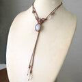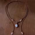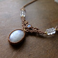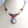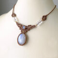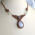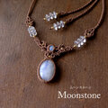 魅力的な二つのムーンストーンを繊細に編み込んで、首元を彩る女性らしいマクラメ編みアクセサリーに仕上げました。