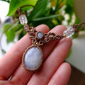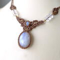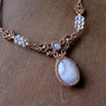 淡く乳白色の中に、見る角度によって月のように青白く輝くブルーシラーが幻想的にきらめくスリランカ産ムーンストーンと小粒サイズですが上部にも艶があり魅力的に輝くインド産ムーンストーンを組みあわせたた1点ものマクラメ編みチョーカーネックレスです。