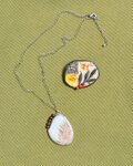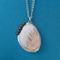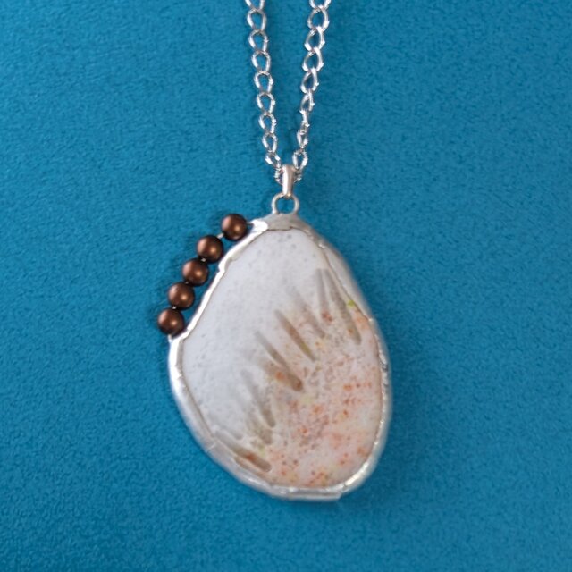 白~茶のガラス粉末とストリンガーをヒュージング(溶着)したパーツとガラスビーズを組み合わせたステンドグラスのペンダントです。