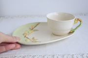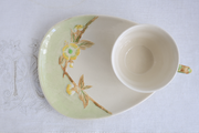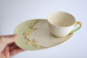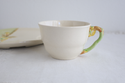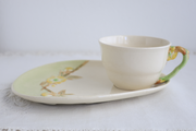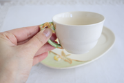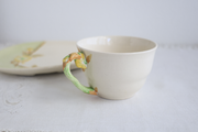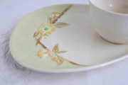 ハンドル部分は植物の枝を模した造形となっています。プレートに描かれた春らしい黄色の花々は、エンボスに一点ずつ丁寧にハンドペイントで仕上げられており、柔らかな色彩がテーブルを明るく彩ってくれると思います。