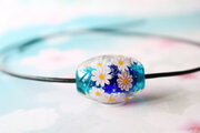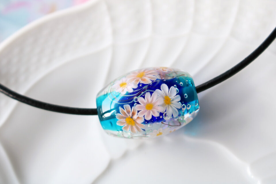 泡を入れた青×水色の地に、マーガレットを咲かせたとんぼ玉です。