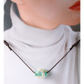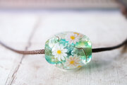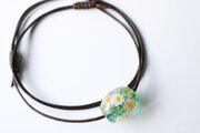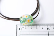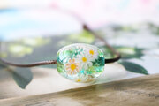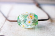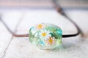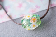 泡を入れた水色×黄緑の地に、マーガレットを咲かせたとんぼ玉です。