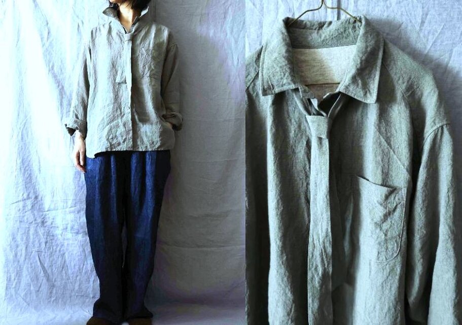【受注制作・丈変更可】スレートグレー/天日干し40リネン タイ付き長袖シャツ