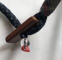 中綿を入れ綿の絣の着物で作ったループを付け、ループの先に水晶玉と山サンゴ、途中竹具を長さ調整金具の代わりにを付けています。
