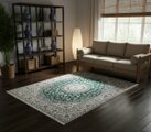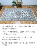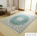 この絨毯のデザインは、中央にメダリオンと呼ばれる円形の模様が配され、その周りを植物模様が囲んでいます。落ち着いたグリーンを基調とした色使いが、お部屋を穏やかに包み込みます。