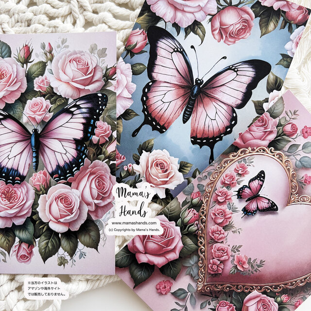 ⭐️《ポンパドール・ローズ》☘️優雅なロココ調 蝶と宮廷薔薇園 ハート イラスト アート ポストカード 3枚 ハガキ セットです♪