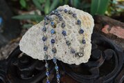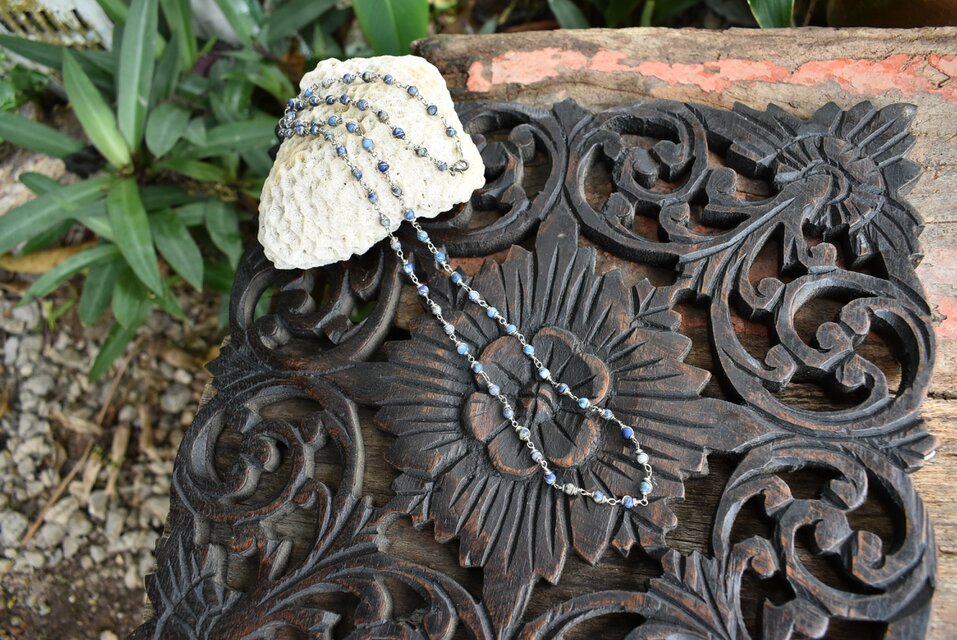 小ぶりのラピスラズリビーズをワイヤーでひとつひとつ結んで、ロングサイズのネックレスを制作しました。いろんな色味のラピスラズリを楽しんでいただけたらと思います。