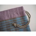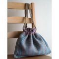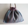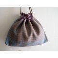 手染めの麻糸を用い、手織りで作り上げた織生地と麻布を合わせてお作りした巾着バッグです。