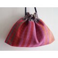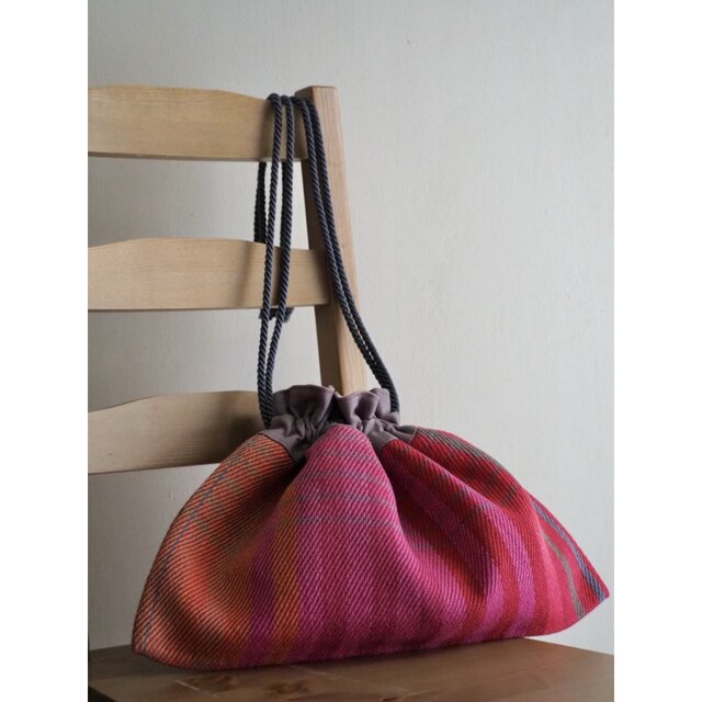手染めの麻糸を用い、手織りで作り上げた織生地と麻布を合わせてお作りした巾着バッグです。