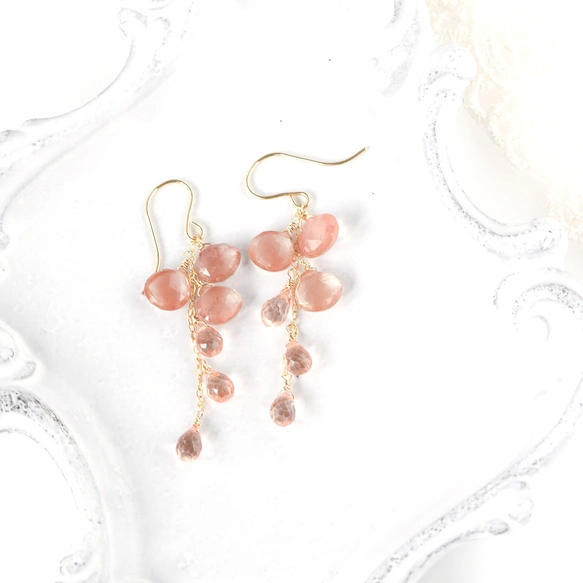 春色 ― ピーチピンクアンデシンとオレンジトパーズのロングピアス14kgf