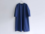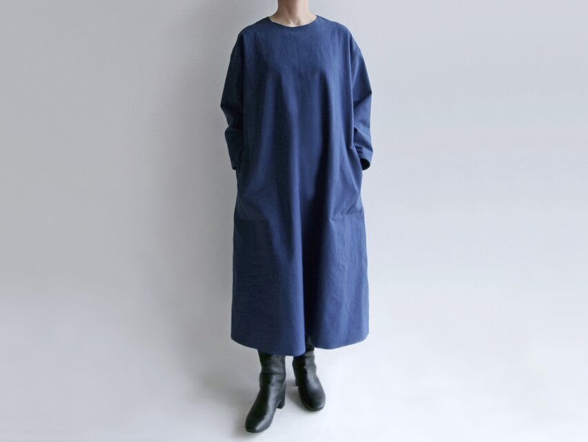 ドロップショルダーのゆったりとした肩から裾に向かってストンと落ちる、あまり広がり過ぎないシルエットの、ボディラインを拾いにくいワンピースです。ラウンドネックに少し短めの長袖の筒袖で、ごくごくシンプルに仕上げてみました。
