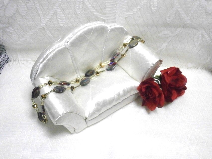 ・光の加減で、ゴールドやシルバーが見えて、洋服を選ぶのが楽しくなりそうなネックレスです。