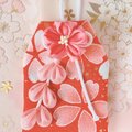 お守り袋には花と下がりを添えました。花は日本の伝統工芸の一つであるつまみ細工という技法で、花びら1枚1枚作っています