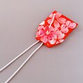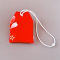 紅色に桜柄の着物生地を用い、ミシンは使用せず、一針一針心を込めて手縫いで仕立てています