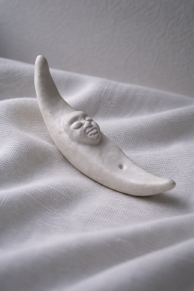 長さ12cm 夜の隅で、そっと目を閉じる月。 なにも語らず、ただそこに在るだけで、 部屋の空気を静かに変えていく。 真ん中の穴にお香を差し込むこともできます。