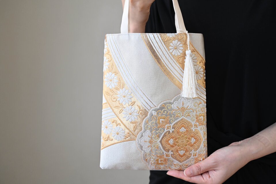 シルバー・ゴールドの帯地に華紋様があしらわれたシルク帯で製作したミニサブバッグです。