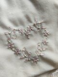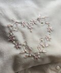 白のベロアにベビーピンクのリボンと刺繍糸でハート型のガーランドを刺しています。
