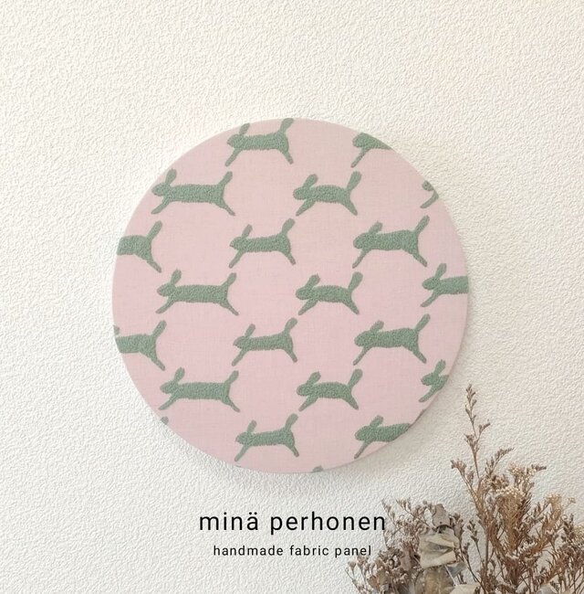 丸型 ファブリックパネル ミナペルホネン 北欧 うさぎ ランランラン ピンク 玄関飾り インテリア 刺繍