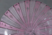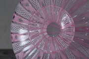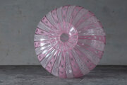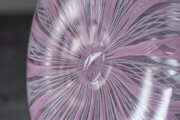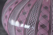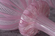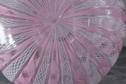 ピンクと白の繊細なレース模様がガラスの中に織り込まれ、光とともにやわらかく揺らぐような表情を生み出しています。