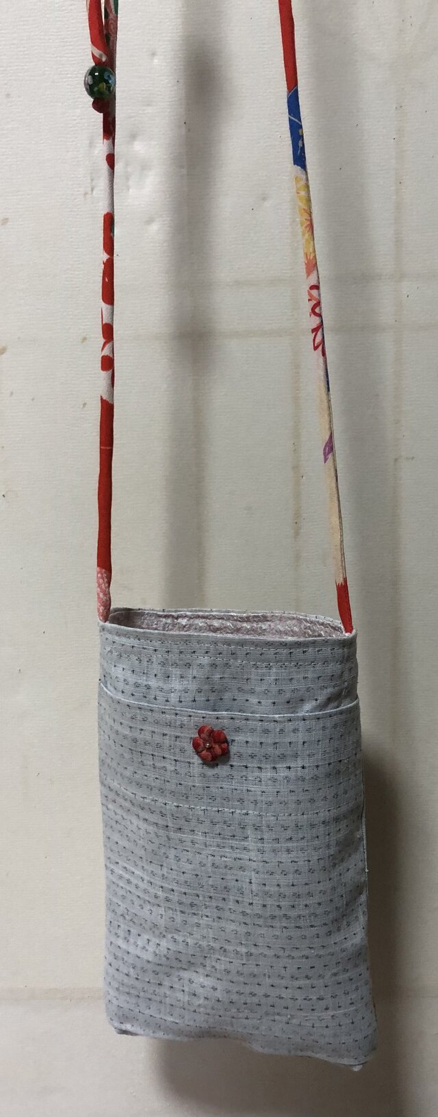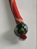 中綿を入れ正絹の着物で作ったループを付け、ループの先にトンボ玉と山サンゴを付けています。