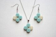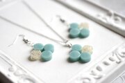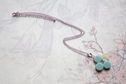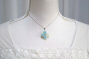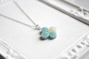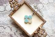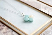 不透明なブルーの粒を三つ、そしてお花にパール、ブリオンを沈めた透明の粒を一つアクセントに連ねた、可憐なペンダントです。