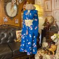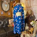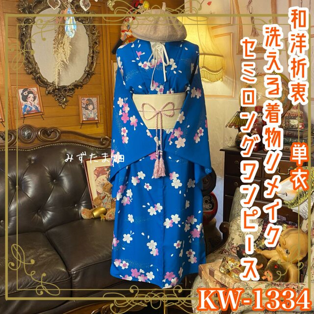 【 単衣着物リメイク セミロングワンピース/ドレス/洗える化繊 帯サッシュベルト 瑠璃の深淵 × 幻想の桜パルス KW-1334】