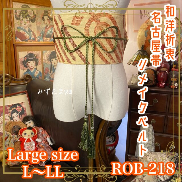 名古屋帯 リメイク サッシュベルト 飾り帯 和洋折衷 L〜LL対応 練色の階層 × 伝統の幾何学グリッド ROB-218