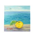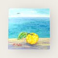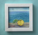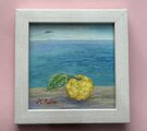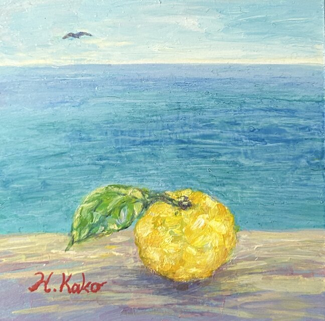 葉のついた柚子と海のコラボです。遠くにカモメが飛んでいます。