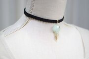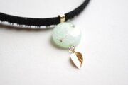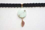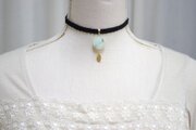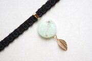 繊細で淡いグリーンがなんとも初々しく、可憐なカラーリングのレジンを、ベルベットリボンにタティングレースで装飾を施したチョーカーに仕上げました。